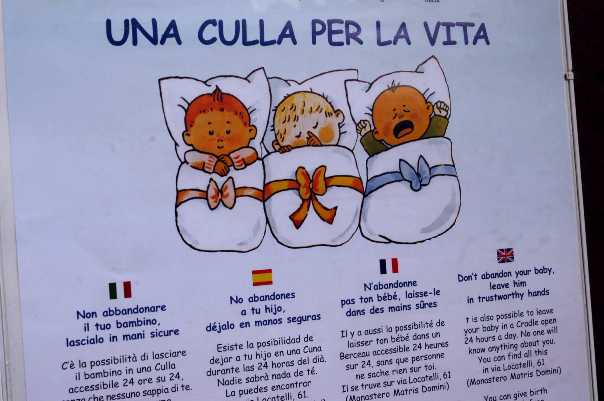 Le culle per la vita sono la versione tecnologica delle antiche ruote degli esposti, antichi dispositivi girevole in legno, solitamente collocati nei pressi di conventi e ospedali, nei quali era possibile lasciare il proprio bambino in modo anonimo e sicuro, garantendo loro accoglienza.  Di culle per la vita si stima ne esistano circa sessanta in Italia, di cui undici in Lombardia. Sono dispositivi legati a strutture sanitarie che consistono in un locale protetto dove, premendo un pulsante, si attiva l’apertura di un’incubatrice riscaldata e climatizzata. Non appena il bambino viene adagiato e lo sportello richiuso, una segnalazione immediata allerta il personale medico o il 118, garantendo al contempo che chi ha lasciato il piccolo non incorra nel reato di abbandono di minore.