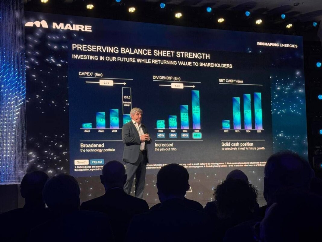 Previsti poi tra 1,2 e 1,4 miliardi di investimenti cumulati, incluse selezionate operazioni di M&A per ampliare il portafoglio tecnologico, concentrati nei primi cinque anni. Rimane in linea con il 2026 il dividend pay-out assunto al 66%, lungo tutto l’arco di piano. Maire si aspetta inoltre disponibilità nette adjusted attese a circa 2,1 miliardi nel 2035, tenuto conto degli investimenti cumulati e dei dividendi