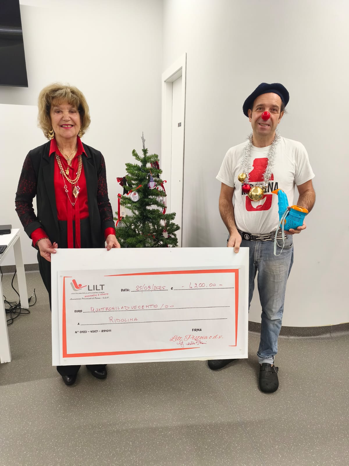 PISTOIA – Nei giorni scorsi, nella sede della Lilt di via Andreini, la presidente Giulietta Priami ha consegnato l’assegno con i fondi raccolti nel corso delle tre edizioni della Pigiama Run all’associazione Ridolina, a sostegno del progetto “Clown in corsia” attivo nel reparto di Pediatria dell’ospedale San Jacopo.